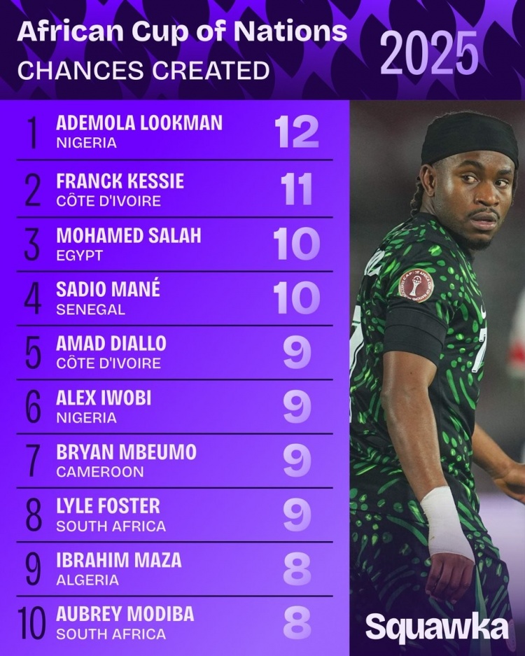 1月9日讯 非洲杯激战正酣,数据机构squawka也统计了本届非洲杯创造机会情况,卢克曼力压群雄居首。