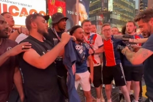 巴黎球迷聚集在纽约时代广场,他们载歌载舞,为球队助威,预热决赛,巴黎官方社媒晒出视频。