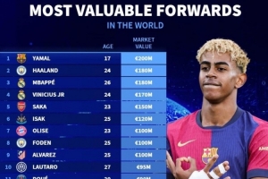 体育资讯6月30日讯 《转会市场》统计了最新的锋线球员身价情况,巴萨17岁小将亚马尔以2亿欧元独自领跑。